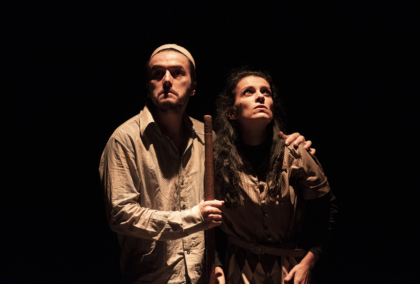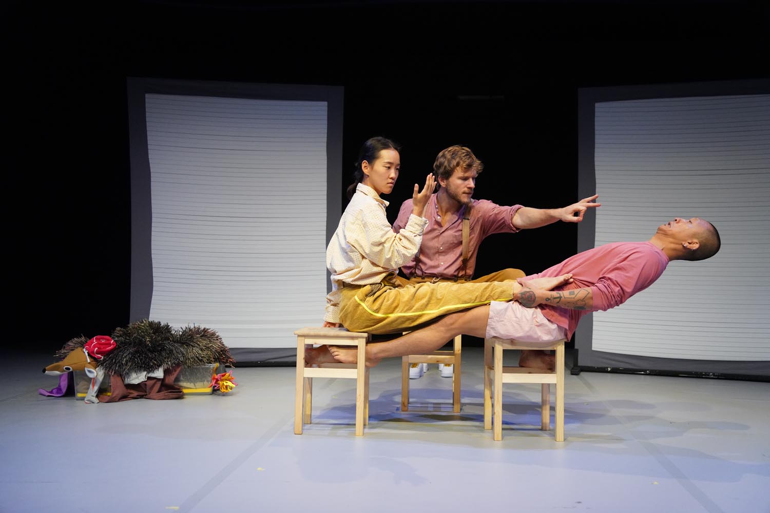Três atores dos dois lados da fronteira sobem ao palco com música ao vivo, transformando o espaço cénico num lugar de riso, memória e reflexão.